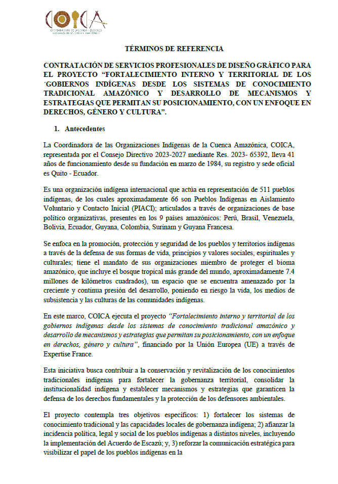 Contratar los servicios profesionales de diseño gráfico para el proyecto “Fortalecimiento interno y territorial de los gobiernos indígenas desde los sistemas de conocimiento tradicional amazónico y desarrollo de mecanismos y estrategias que permitan su posicionamiento, con un enfoque en derechos, género y cultura”, responsable de la producción de piezas comunicacionales.